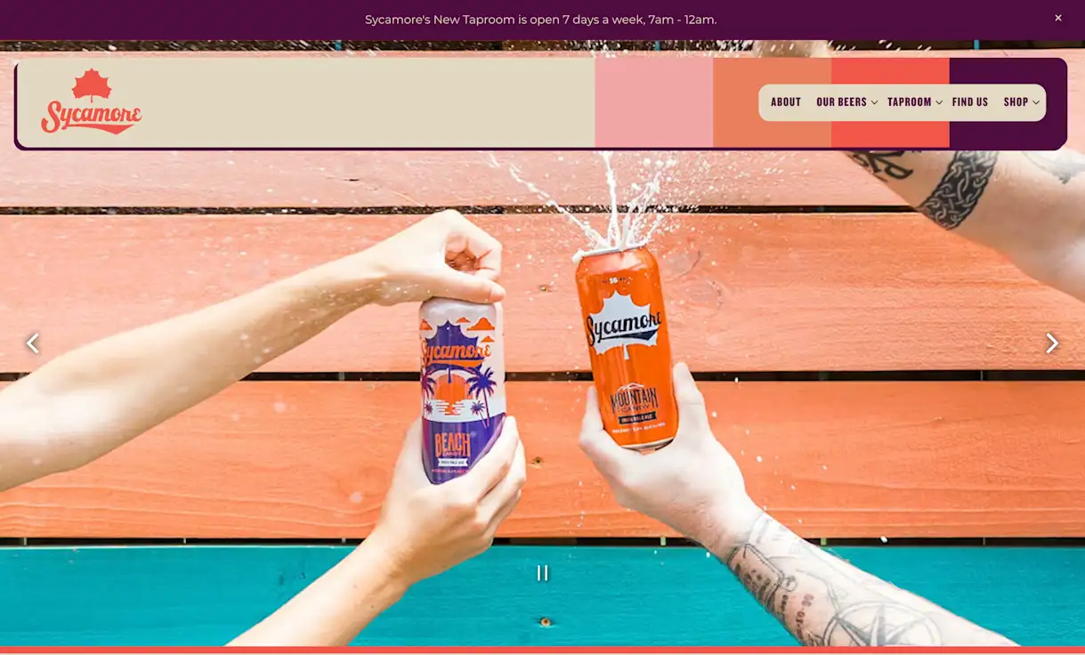 Sycamore Brewing is a Charlotte brewery founded by husband and wife team, Sarah and Justin Brigham. The purple, pink, and orange branding comes to life across their website with beautiful product photography as well.
