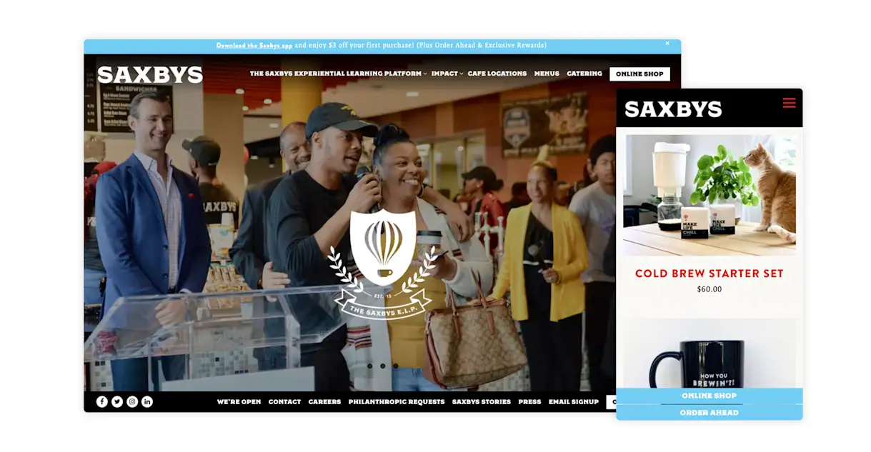 Saxbys is a coffee house chain with more than 20 locations, many of which are at mid-Atlantic colleges. Having already built brand awareness with many guests in its target audience, its website focuses on building brand equity through purpose-driven campaigns and initiatives. This includes a description of its Experiential Learning Platform, which helps provide education to student employees, along with full pages about its social impact and mission. Its merchandise store is filled with at-home coffee supplies, making it easy for site visitors to support them and their mission — while also brewing a great cup of joe.