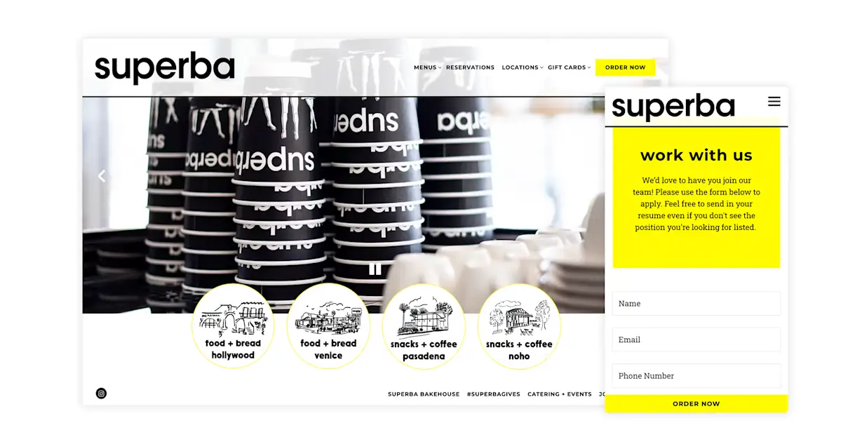 Great web design is achieved through a harmony of standout typography, supporting color schemes and intuitive functionality. Superba’s website achieves this with clean sans serif fonts and a simple black and yellow color scheme. High-resolution photography helps site visitors get a sense of the brand, its offerings and general vibe, while gestural illustrations on the homepage help guests navigate to sections for each of the shop's four locations.