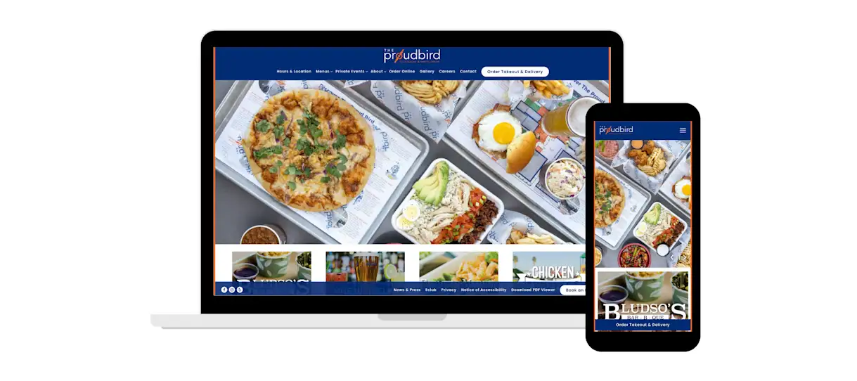 The Proud Bird website features animated planes crossing the screen and dashed flight paths framing certain sections. These subtle nods to aviation in their logo and the design of their website highlight the building’s roots as a front row view to planes landing at LAX. The gallery page features a collection of images that The Proud Bird can upload and manage directly through their dashboard.