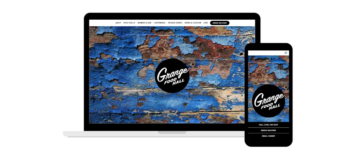 The rustic feel of Grange Food Hall comes alive right on their website homepage with a hero image of flakey blue distressed wood. The Hall’s eight chef-driven food stalls are prominently featured and each have their own page.