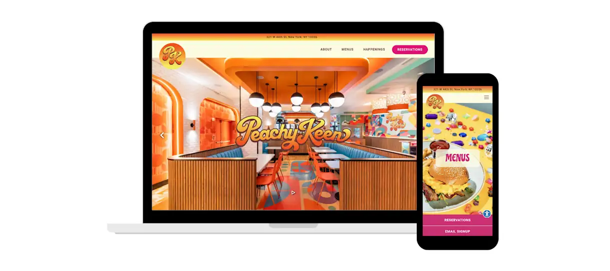 Opened in June 2022, Peachy Keen brings retro '70s vibes to Hell's Kitchen. The concept from HK Hospitality is all about fun, disco and over-the-top nostalgia. Its website reflects this immediately with a banner photo of its electric-colored interior, and it continues being bold and having fun with bright, layered splits and an animated disco ball. Large section buttons grab website visitors' attention and its "Happenings" page keeps the information up-to-date. In short, its website offers a unique style embellished with over-the-top design and photography, which sets the tone for what guests can expect when dining at Peachy Keen.