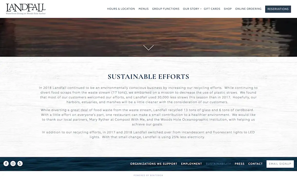 Landfall in Woods Hole, Massachusetts shows the value of transparency with their sustainability page, calling out that the restaurant began taking a series of steps in 2018 to be more environmentally conscious. Some of their efforts have included taking better care to divert food scraps from the waste stream, decreasing the use of plastic straws, and changing from incandescent and fluorescent lights to LED lights to reduce electricity consumption.