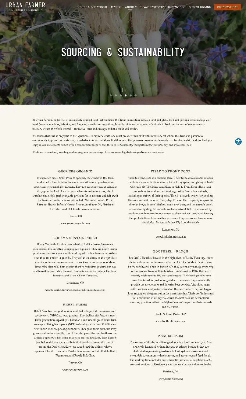 Urban Farmer’s messaging talks about using responsibly sourced food and high-quality ingredients, and their sourcing & sustainability page gives the details on how they act on that promise. By partnering with farmers and ranchers nearby, the restaurant makes use of local harvests and seasonal ingredients for their menu. And they practice what they preach by giving visibility to their list of partners.