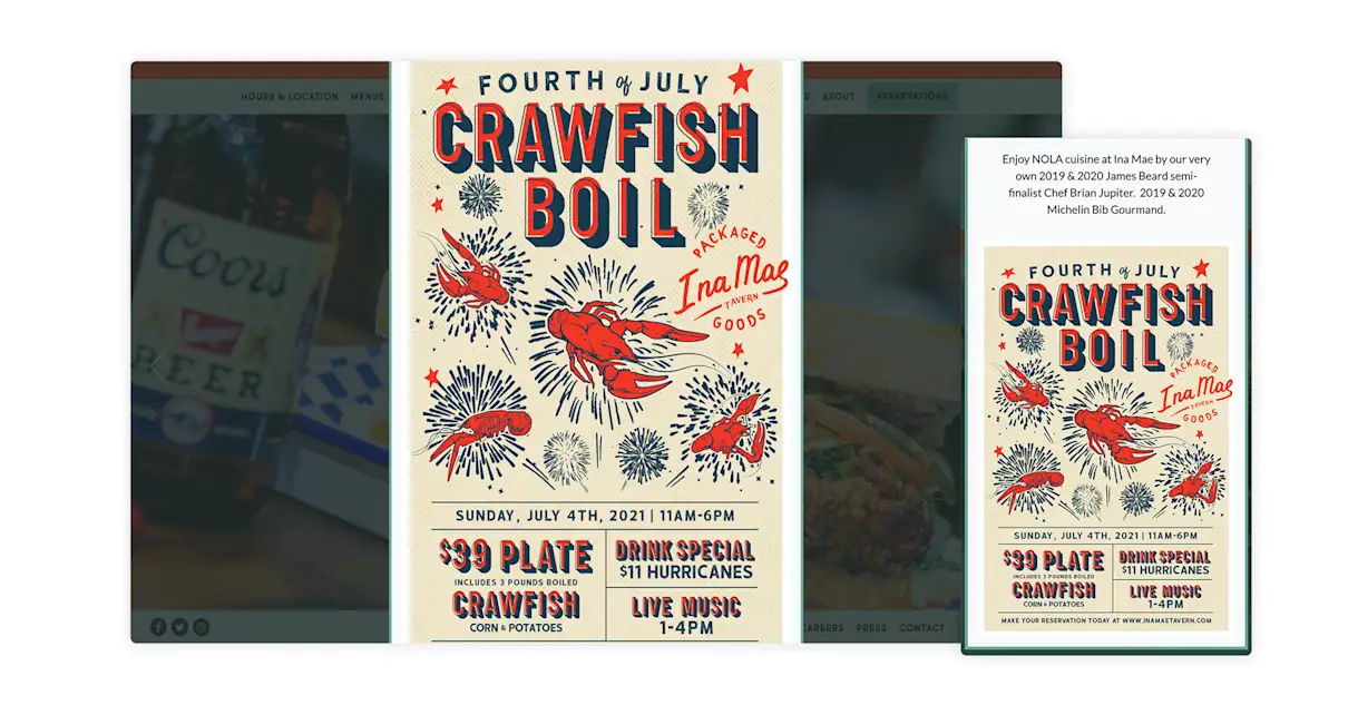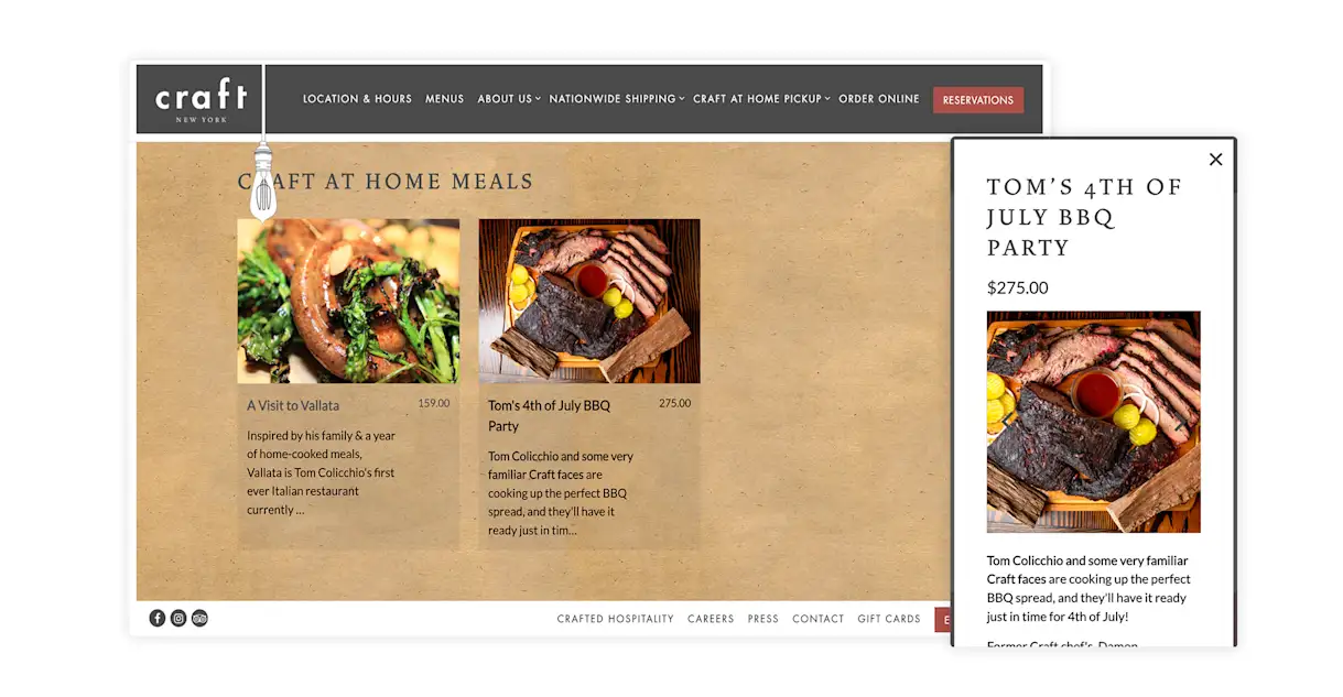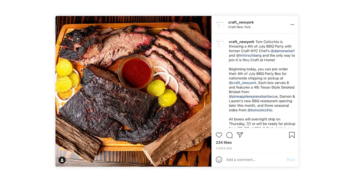 A great example is New York City’s, Craft, which promotes its “Tom’s 4th of July BBQ Party” catering package on Instagram. It’s a great way to extend the visibility of the special, driving traffic back to the website to purchase orders for pickup and delivery.