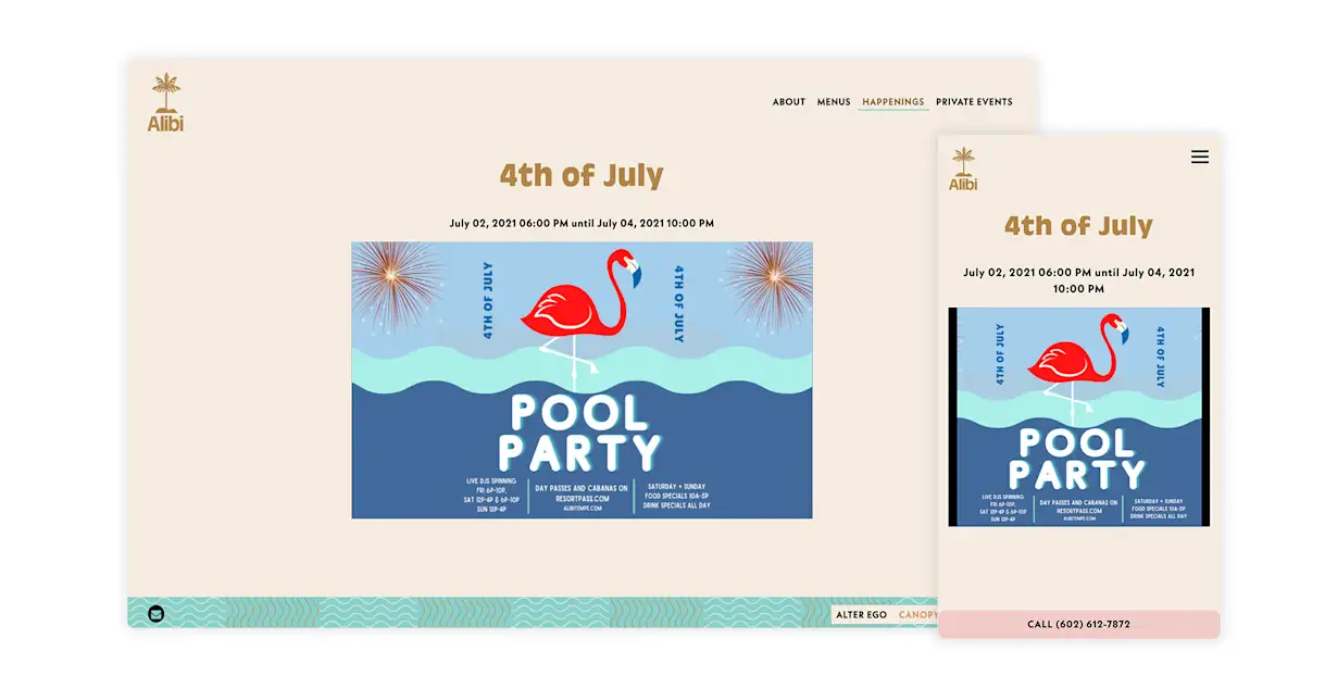Alibi is a whimsical rooftop bar and restaurant in downtown Tempe, AZ. To celebrate the Fourth, the restaurant hosted a pool party all weekend long, featuring DJs, poolside cabanas, and food & drink specials throughout the day and night. Alibi uses their website to host more information about the event under the “Happenings” section, prominently placed in the website’s navigation.