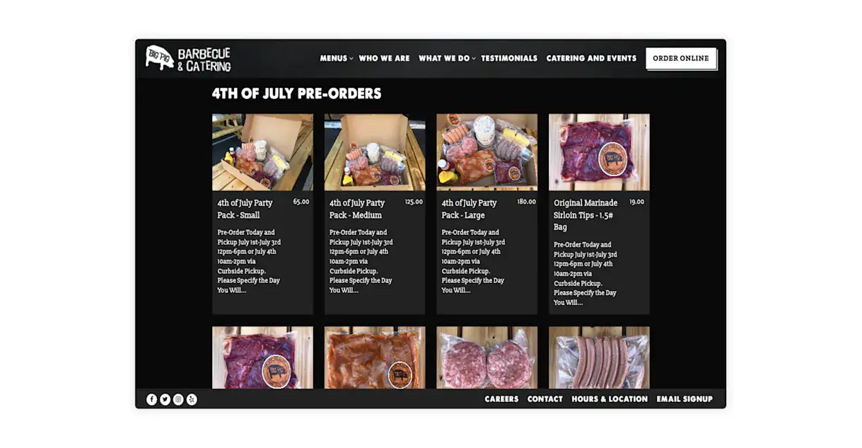 Big Pig Barbecue & Catering in Peabody, Massachusetts, optimized their online catering store to feature “4th of July Pre-Order” packages. Guests could schedule and purchase “Party Packs” in advance for pickup to take home and grill out with friends and family.