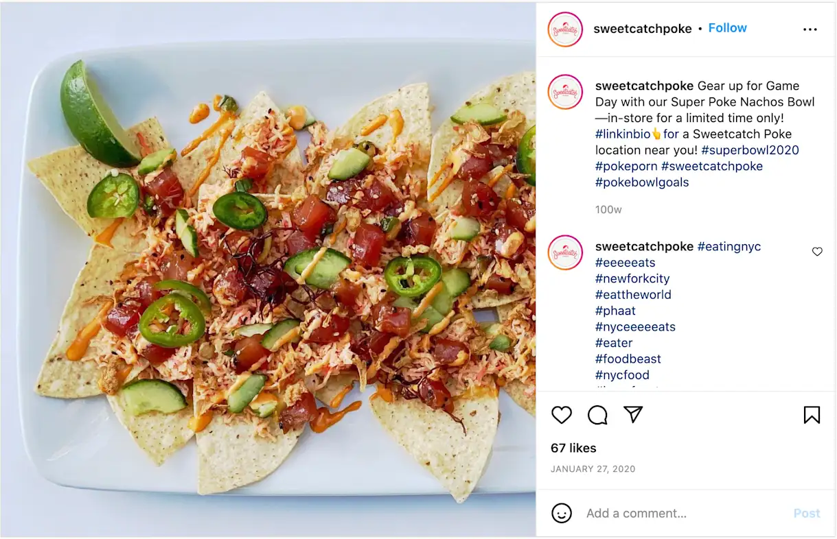 Super Bowl Sunday is a great time for restaurants to experiment with creative twists on game day food. Sweetcatch Poke, a poke restaurant with locations across New York City, used last year’s game to put a Hawaiian twist on American nachos, which diners could only order for a limited time.