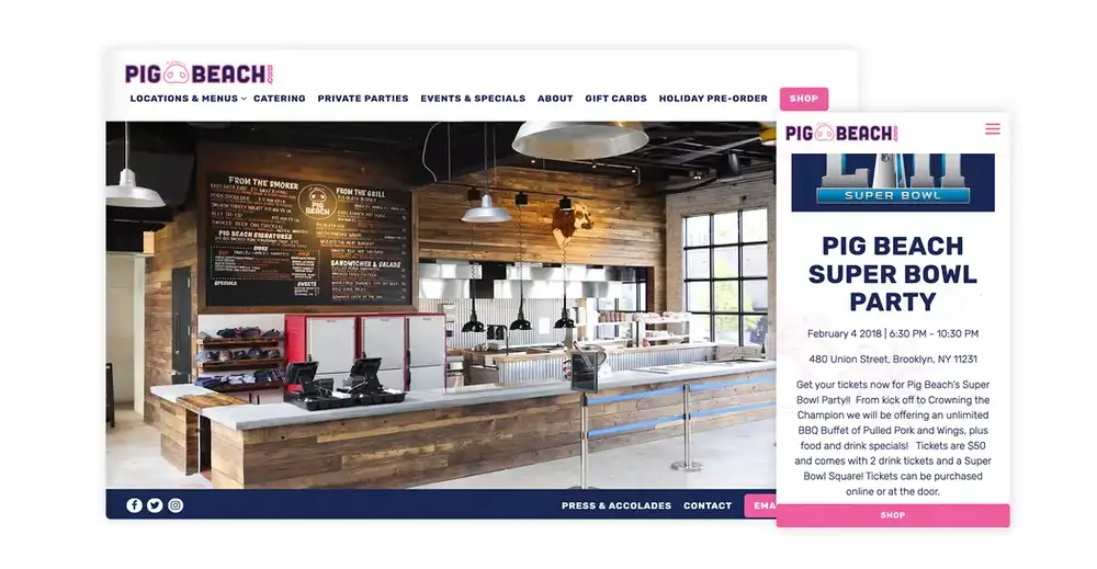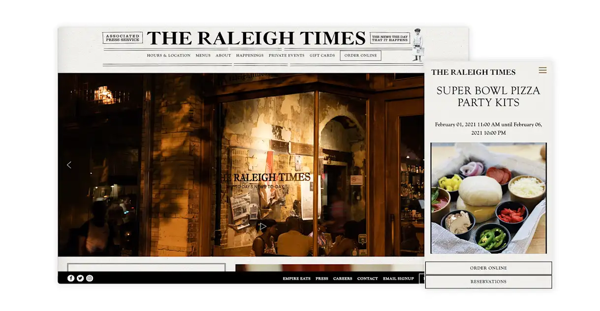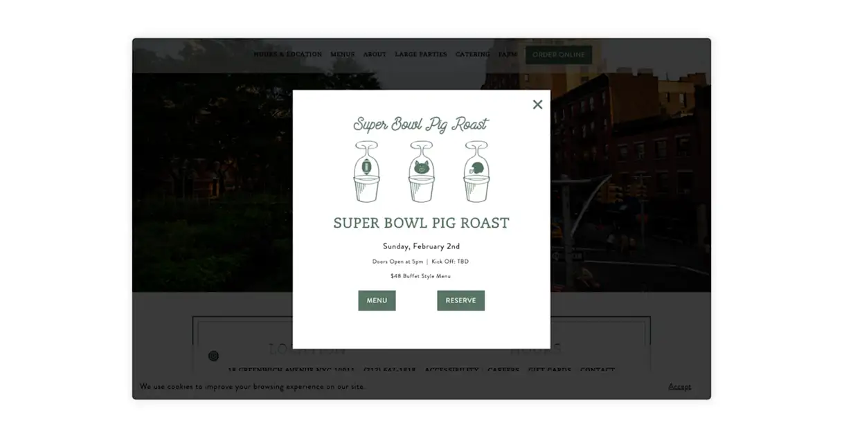 For example, Rosemary's in New York City promoted their Super Bowl Pig Roast event with a popup alert when visitors landed on the website. Guests could view the menu or click on a link to make a reservation.