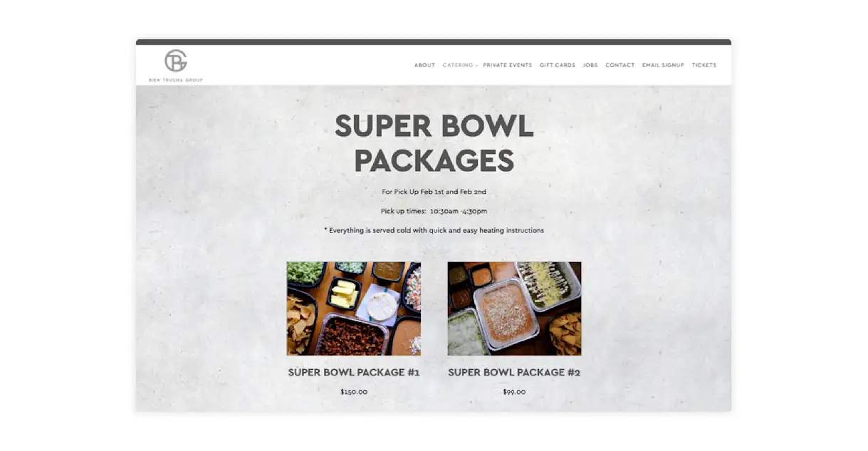 People like to pre-order takeout and delivery in large quantities for game day. One easy way to do so? Offer online Super Bowl catering packages like Bien Trucha Group.
