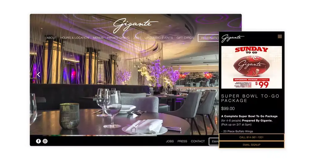 Restaurants can solve these issues by curating full Super Bowl catering packages, as Eastchester, New York restaurant Gigante did. The package included a diverse spread of game day food (pizza, pasta, meatballs, wings, ribs), and the webpage clearly outlined that it served 4-6 guests.