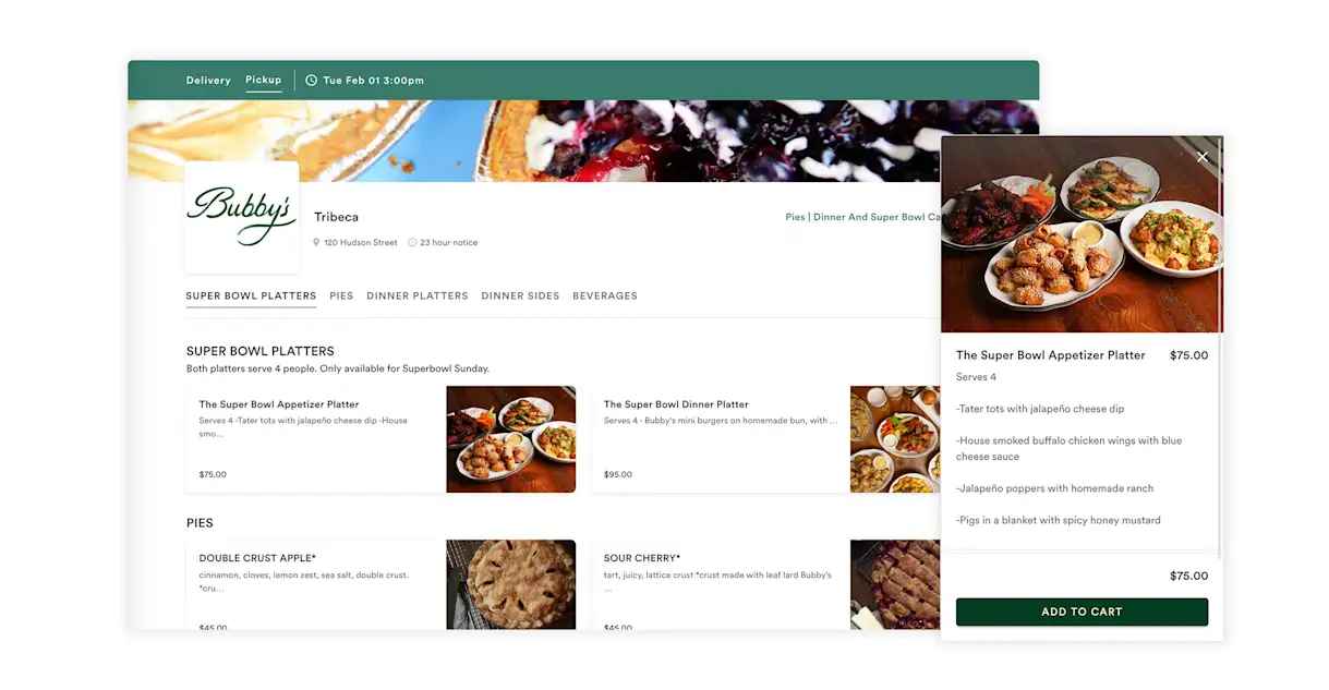 Bubby's offers the package through a user-friendly and mobile-optimized online catering store, which reduces diner frustration and increases checkouts. It also uses smart menu surfacing to control which fulfillment dates the Super Bowl package appears on.