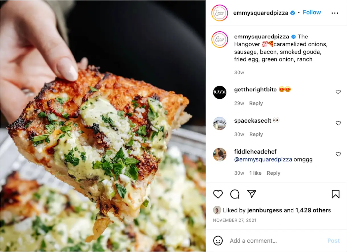 The Instagram profile for Emmy Squared has plenty of promotions, discounts and event reminders. However, they’re intertwined with close-up shots of their mouthwatering pizza and sandwiches. These are the posts that bring in and retain followers so that when the restaurant posts more promotional content, they reach a wider audience. When applying the Pareto Principle (or 80/20 rule) to an Instagram strategy, it means that only one out of five posts should outwardly promote sales, while the rest should focus on audience engagement and entertainment.