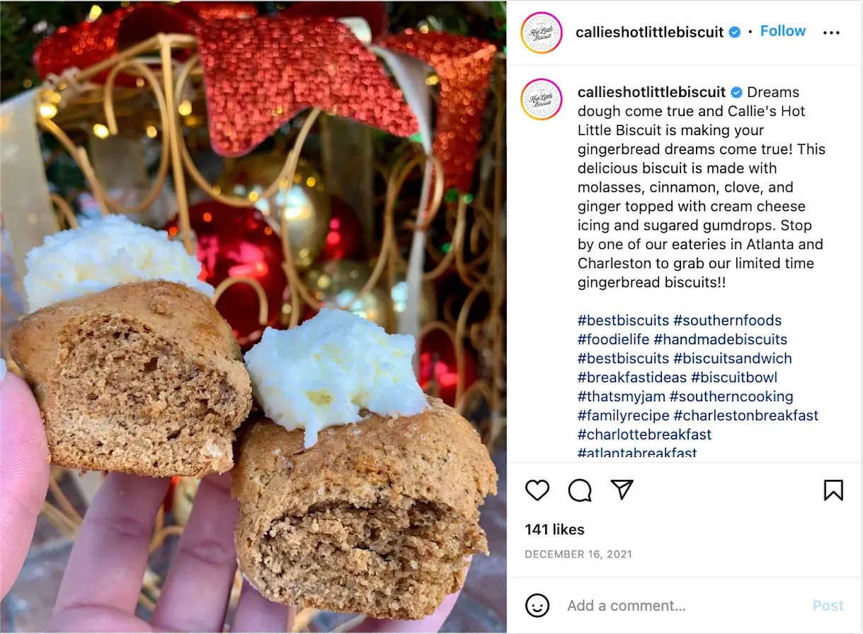 In the example above, Callie’s posted an image of their signature biscuits with a Christmas-themed backdrop to catch followers’ eyes. When looking at the caption, it’s specified that these are (limited-time) gingerbread biscuits. The post went live with ten days to spare before Christmas, combining the urgency to try these specials before they’re gone with a holiday theme to the content itself.