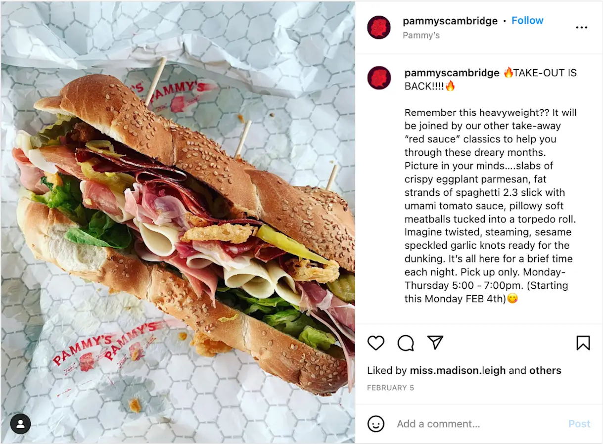 Having “comment below!” or “like this post!” in every caption isn’t the move here. Instead, follow the example above set by Pammy’s. They announced that their takeout menu was back and posted a super tasty looking hero sandwich with a prompt to “Tag a friend you’d like to get cozy and share a HERO with!” The post received lots of engagement and chatter in the comments.