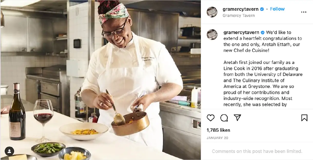 Staff highlights come in many forms. At high-end eateries, a formal introduction of who masterminded the meal adds a personal touch to the dining experience. New York’s Gramercy Tavern does this in the example above, highlighting the Chef de Cuisine’s role, education and accomplishments. More casual restaurants might want to do a less formal staff intro, or even sit them down for a Q&A for an Instagram Story or Live.