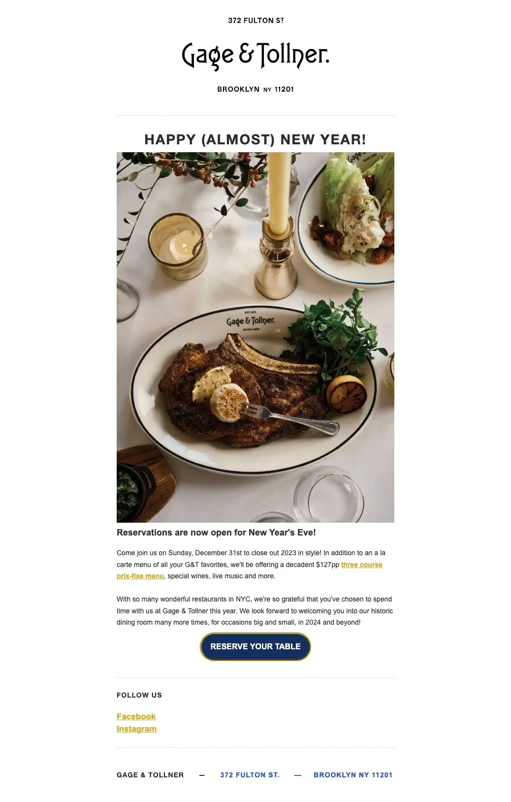 Gage & Tollner in New York City sent the email below to promote its three-course menu and encourage reservations. What works well is the beautiful food photography, short and simple content, and prominent call-to-action (CTA) button.