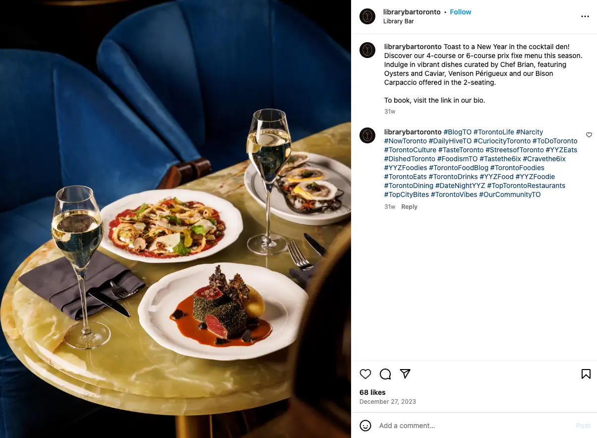 Post on Social Media: Social media is a fantastic channel for discovery and inspiration. Followers of your channels use it to learn more about your brand, view food photos, and hear about future happenings. That’s why restaurants should post often about big events like New Year’s Eve, as Library Bar at Toronto’s Fairmont Hotel did on Instagram earlier this year.