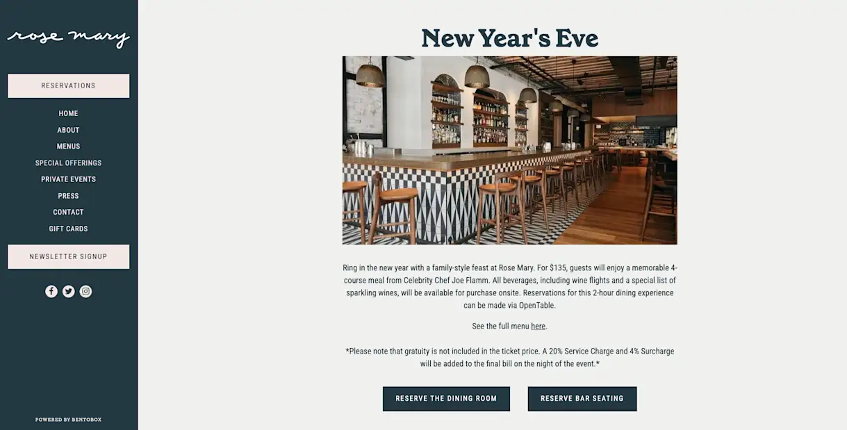Capitalize on this by promoting events and happenings on your website, typically with a dedicated events page like the example below from Rose Mary in Chicago . With a growth-focused website through the BentoBox Marketing & Commerce Platform, you can also issue pop-up alerts on your homepage and seamlessly sell event tickets online.