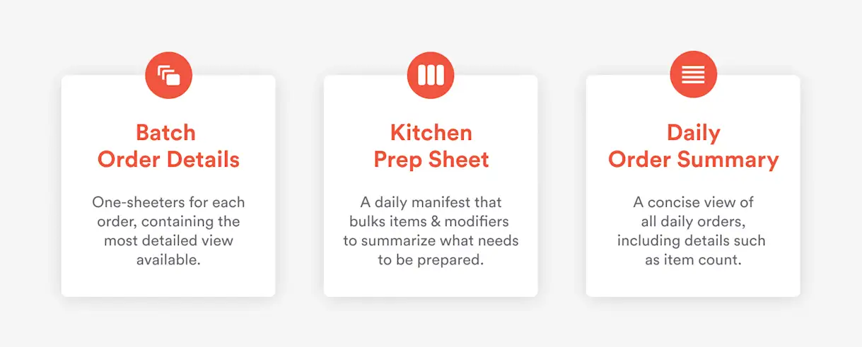 Solution: Online Catering automatically prepares three documents to streamline kitchen operations: Batch Order Details, Kitchen Prep Sheet and Daily Order Summary.