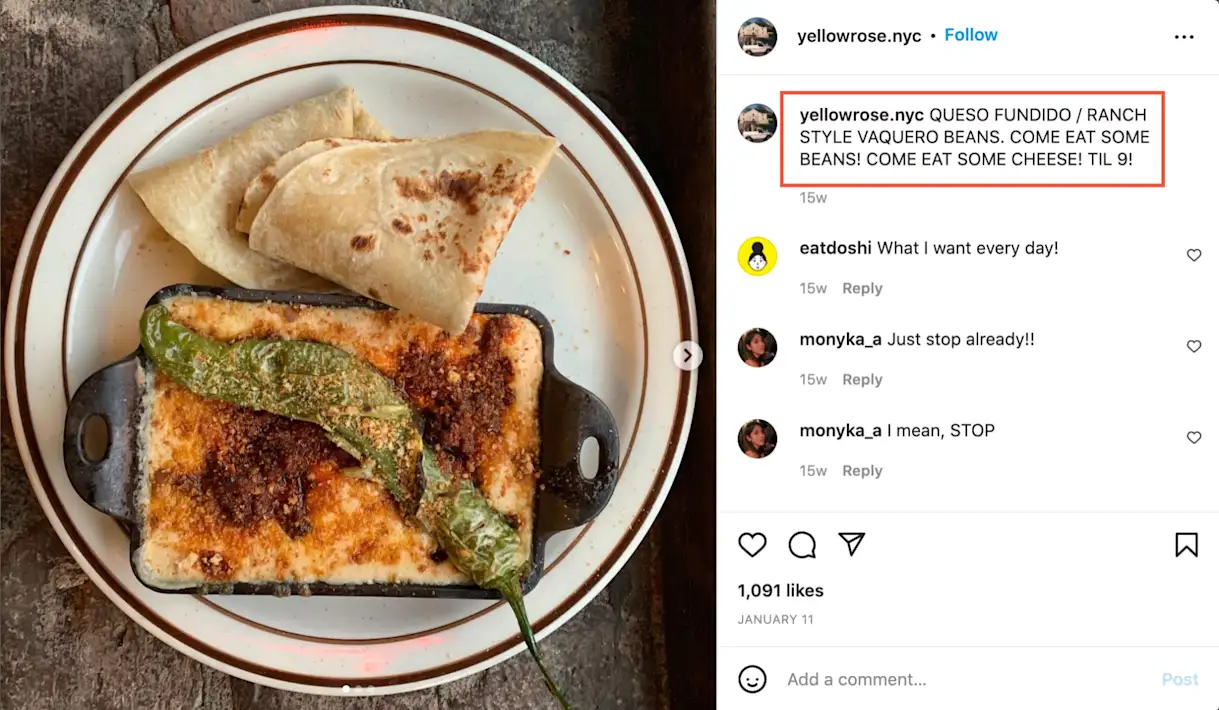 For example, Yellow Rose is a self-described "humble" Tex-Mex restaurant in New York City. It has a friendly, low-key, neighborhood vibe that creates deep connections with customers. On Instagram, where it has more than 15,000 followers, it plays up those attributes with comically familiar copywriting, often in all-caps: