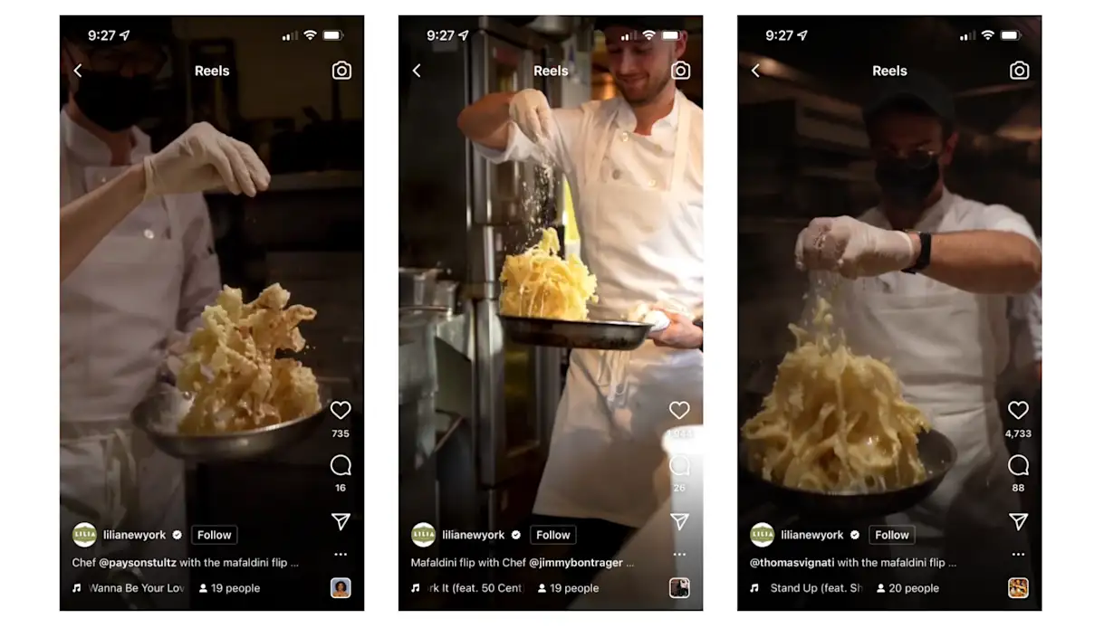 For example, Brooklyn pasta restaurant Lilia creates a series of Instagram Reels called the "Mafaldini flip." Each installment is a short, slow-motion video of a different staff member flipping the restaurant's Mafaldini dish in the pan. Each video is also set to a different song, including appropriate scores like "Stand Up" by Ludacris, which helps keep each installment fresh: