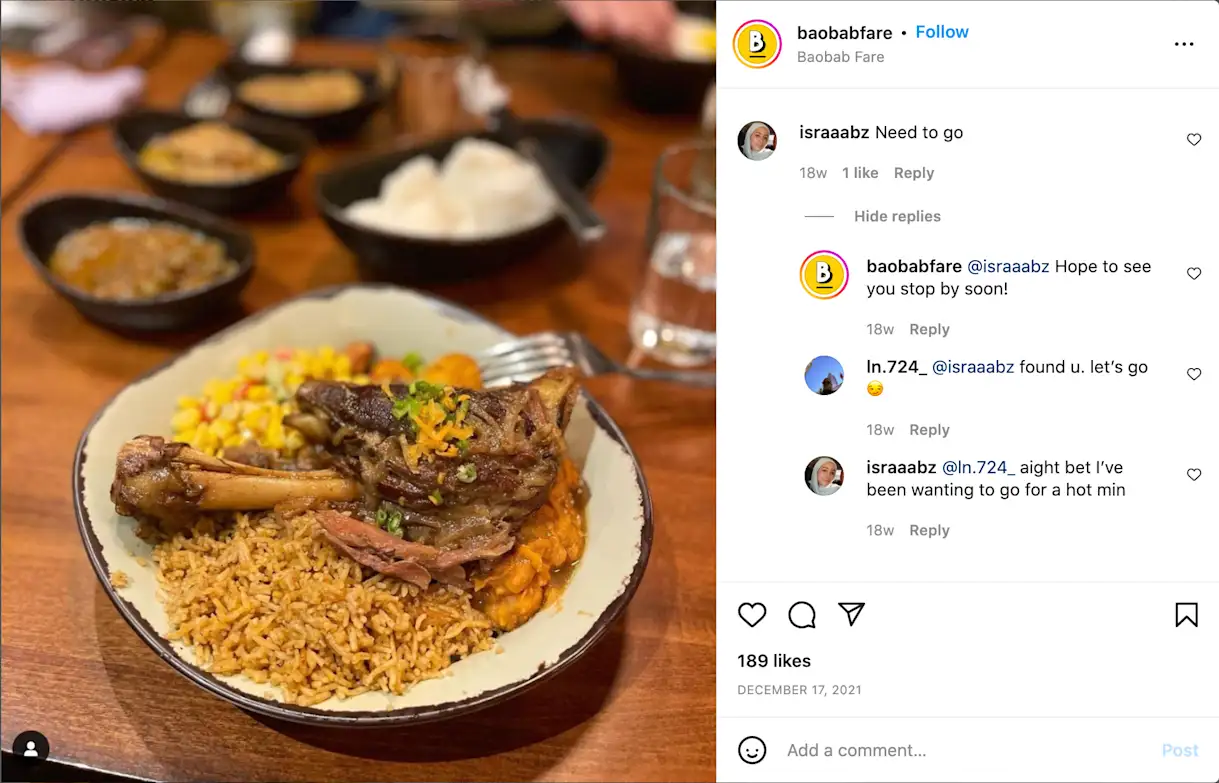 Respond to direct messages. Repost photos you're tagged in. Comment back and start a conversation. A positive back-and-forth on social media is just like a playful exchange between a server and a table on-premises. It builds goodwill and relationships in an industry built on them.