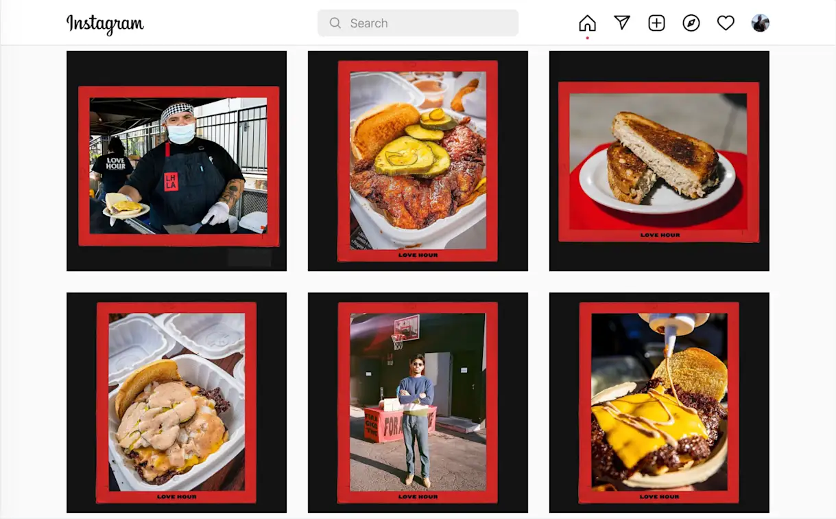 One way to overcome this is developing a unique visual style — usually with graphic design — that complements restaurant photography. Los Angeles burger spot Love Hour does this by applying a black-and-red frame around photos, creating an eye-catching Polaroid effect in the news feed:
