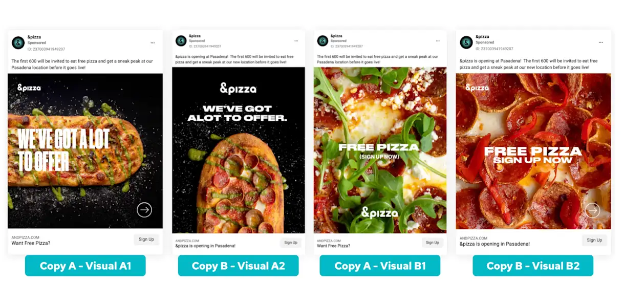 You may think the one piece of content you created is perfect for your ad campaign, but you have nothing to lose by creating at least a couple variations. A variation can be as big as a content format (image vs. video) or as small as a tweak to the copy. See here for an example of four variations in a Facebook ad campaign from &pizza:
