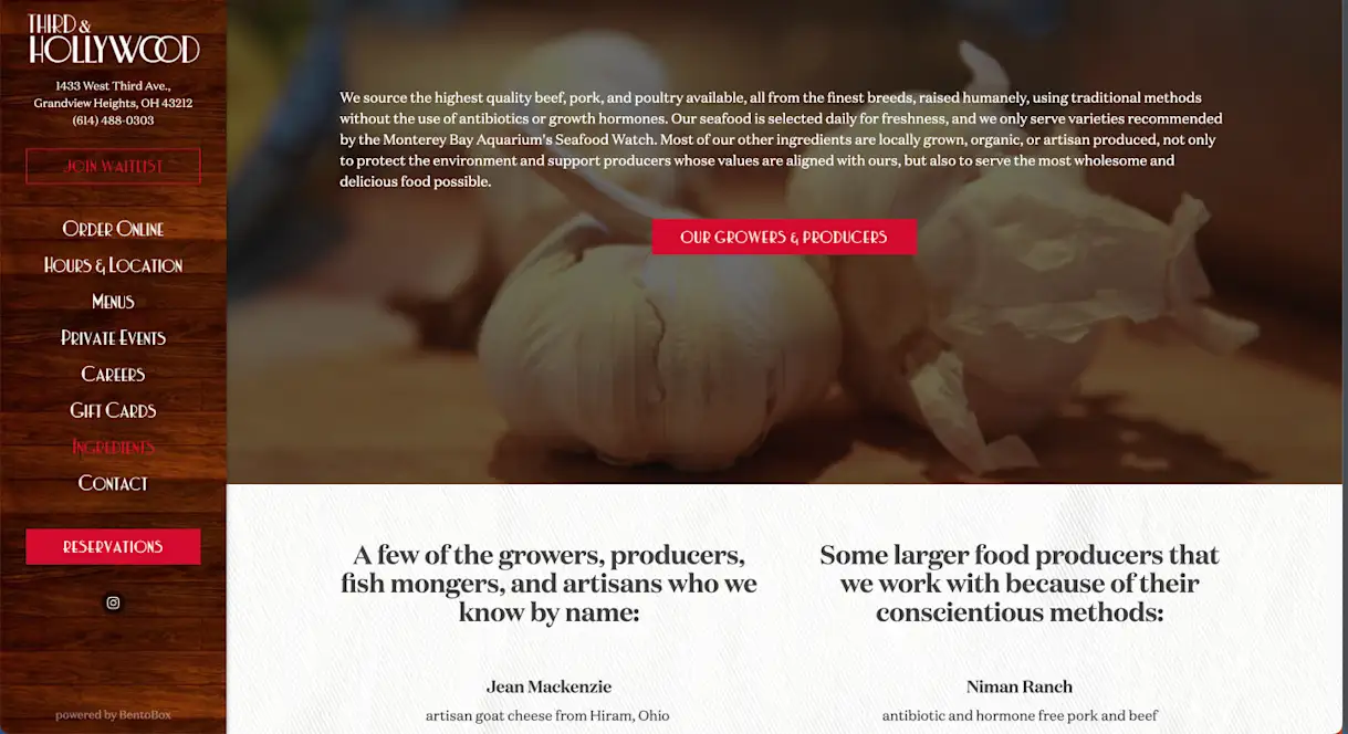 Even if the cottage food isn’t a prominent part of your offering, it’s still worth it to promote your conscientious bona-fides in your messaging. Consider adopting a more general story about what local foods mean to you. The Ingredients page of the website for Ohio restaurant Third & Hollywood combines the two approaches, making an overall brand statement above a list of independent vendors they “know by name.”