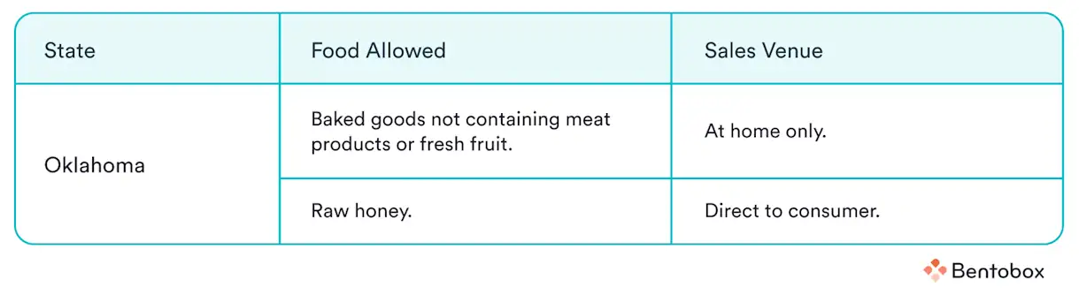 In many cases, cottage food laws only permit direct-to-consumer sales. Take, for example, Oklahoma’s law: