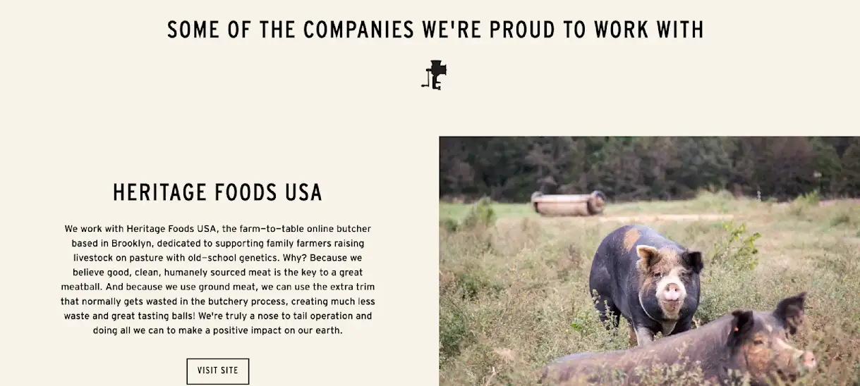 If the cottage food is a star on your menu, make the vendor a star in your messaging! On The Meatball Shop’s Sourcing page, for example, each vendor and the ingredient they contribute to the restaurant are prominently shouted out. These aren’t cottage food vendors, but the messaging demonstrates how to build intentional sourcing into a restaurant brand.