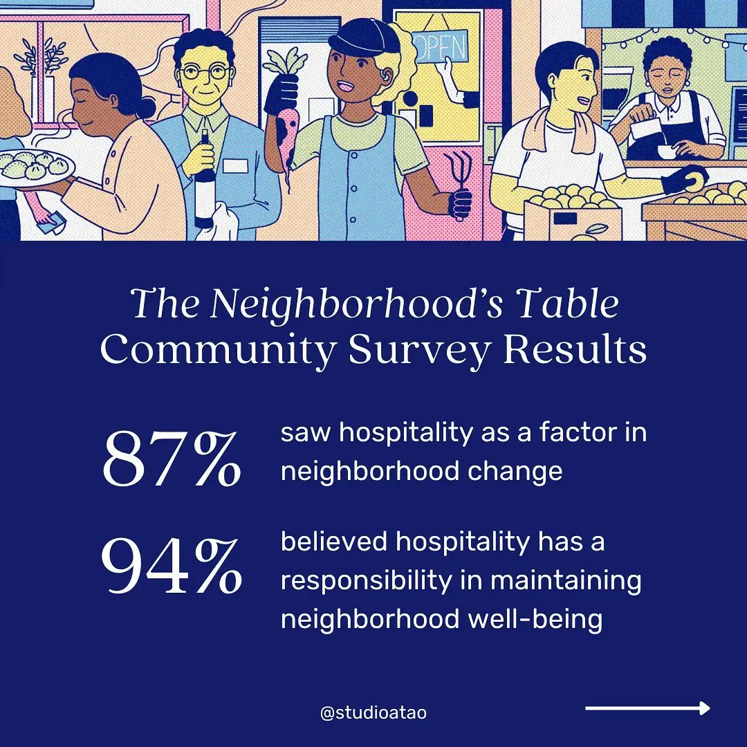 Huang: The Neighborhood’s Table is a toolkit we wrote to give hospitality business owners some concrete things they can commit to before, during and after they open for business in a gentrifying neighborhood. These include action items and questions like, “How do I engage the community? How am I going to serve guests? What questions should I include in that neighborhood survey? Where should I go to meet people?” They’re some of the considerations operators might be asking before they open. The goal is to communicate, within the economic realities we have, “How can I not be a gentrifying restaurant but instead engage the community and invest in the people I’m opening a business around?”