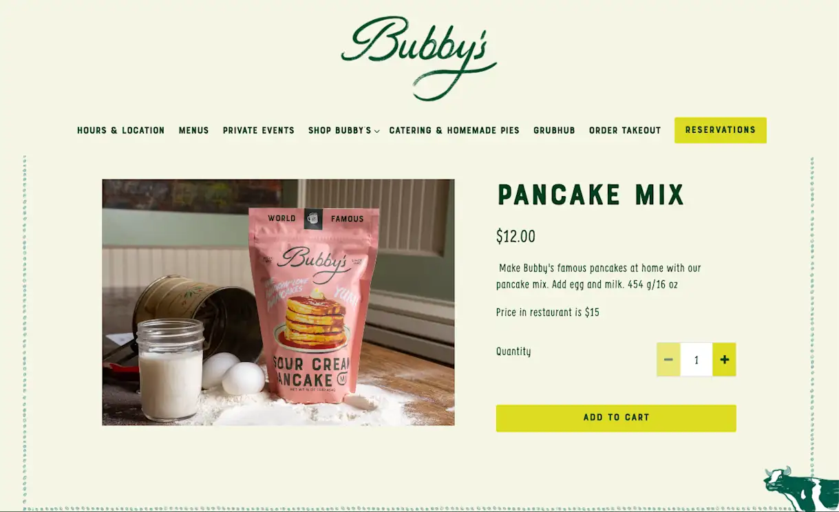 The most popular physical restaurant merch item of December 2022 (not a gift card) is this take-home pancake mix from Bubby’s, a beloved neighborhood restaurant and pie shop in the heart of Manhattan’s Tribeca. (Honorable mention goes to Bubby’s fast-moving Doodle Mug, which is a coffee mug featuring artwork by founder and owner Ron Silver.)