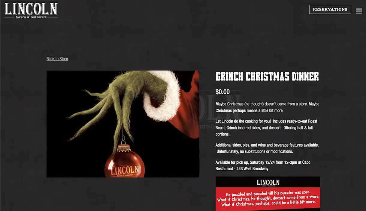 Probably the most creative Christmas dinner package of the year, Boston’s Lincoln Tavern & Restaurant serves up a hearty meal for either 4 or 8 people in homage to this holiday anti-hero. The main course is, you guessed it, roast beast. You’re a mean one, Lincoln Tavern!