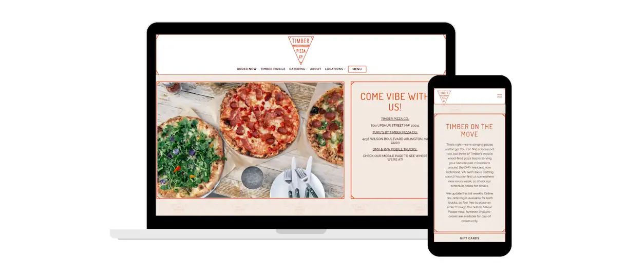 Friends Andrew Dana and Chris Brady started Timber Pizza Co. in 2014, slinging pizzas from a '67 Chevy pickup truck on their off-hours. After chef Dani Moreira joined the team, the restaurant opened its first brick-and-mortar and hasn’t stopped since. Its website showcases its casual pizza vibes with high-resolution photography, illustrated backgrounds and fun but informative content. With multiple locations (and more coming soon), its easy-to-navigate website helps visitors find schedules and information about the nearest store, including its three mobile wood-fired pizza trucks.