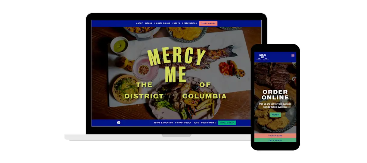 Located in the Yours Truly hotel in Dupont Circle, Mercy Me creates a casual but elevated culinary experience for any occasion. Self-coined as a "sorta South American hangout," the restaurant delivers a vibrant vibe on its website with bold blue, mint green and coral pink tones and high-resolution photography. Illustrations of South American wildlife soften its bold aesthetics, adding a playful touch, while an optimized direct online ordering platform delivers commission-free revenue.