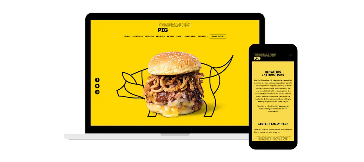 Known as one of Washington D.C.'s most famous barbecue joints, Federalist Pig celebrates American barbecue with a modern flare. Its website matches its iconic aesthetic with bold colors, minimalist line art and subtle animation. Bold call-to-action buttons help visitors find what they’re looking for, including helpful resources like its comprehensive reheating instructions for takeout. Banner alerts also show them up-to-date news, specials and promo codes.