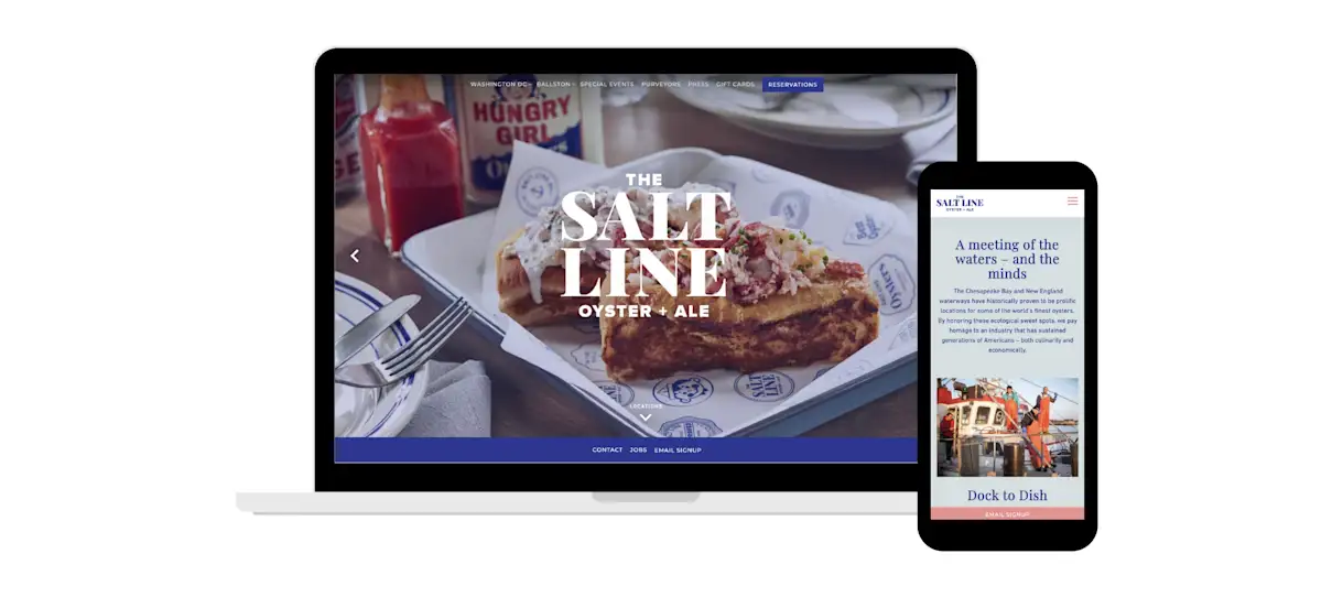 The Salt Line brings classic New England dishes to the shores of the Potomac. With navy blue, seafoam green and salmon pink tones, along with nautical typography, its website replicates the coastal vibes of its interior. However, its website does more than set the tone for diners; it builds community between diners and partners with a dedicated page highlighting the restaurant's purveyors.