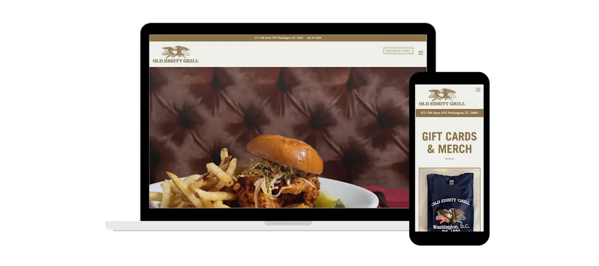 Founded in 1856 and located steps from the White House, Old Ebbitt Grill is Washington D.C.'s oldest saloon. Its website replicates its old-world charm with antique-washed tones of brown, beige and brass, while past and present photographs honor its legacy. Beyond a restaurant and bar, Old Ebbitt Grill offers six private event options and wedding reception packages, which are all accessible on its website. More than a source of information, its website also generates revenue with its merchandise store and digital gift cards.