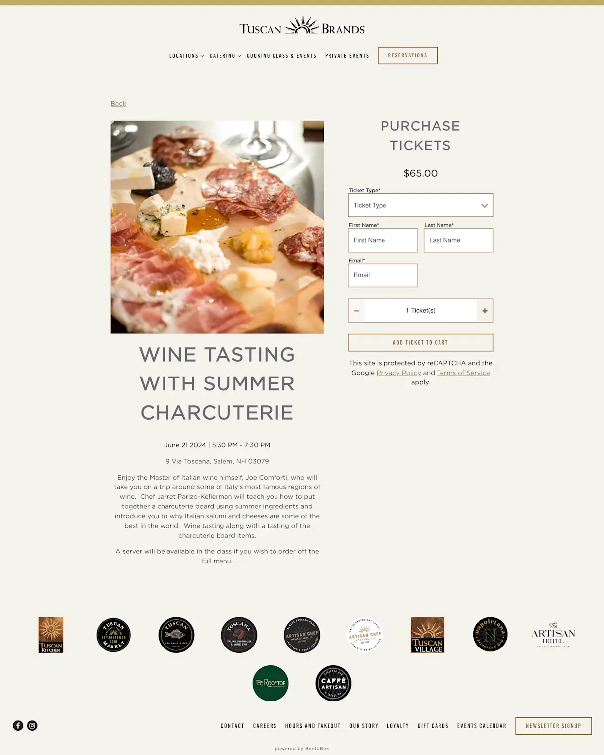 After you’ve planned your event, it’s time to build out an event page on your website. Decide on an event title, write a detailed description about what will be offered, and make sure to put the time and place. Below is a great example from Tuscan Kitchen in Salem, NH, an Italian restaurant that offers nearly 30 classes per month.