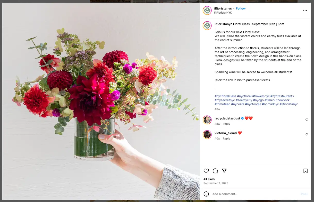 Il Fiorista in New York, New York regularly posts on its Instagram account to promote the spot’s flower arranging workshops. The example below features a stunning image to capture attention and uses the caption to share important details like date and time. There’s a short yet informative description followed by a strong call-to-action to “Click the link in bio to purchase your tickets.”