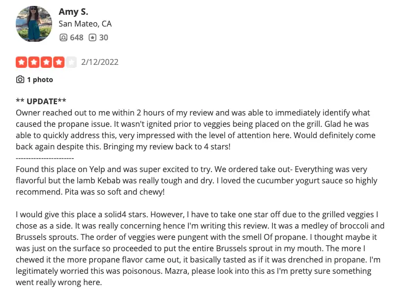The tactic here? Set aside 10 minutes every day (yes, every day) to respond to reviews, whether they are positive, negative or mixed. Doing this shows how committed the restaurant is to learning from customers and acting on their feedback. Plus, great review responses can change peoples' minds after the fact. Note how a speedy response from the team at Mazra brought this Yelp reviewer’s rating up one star.