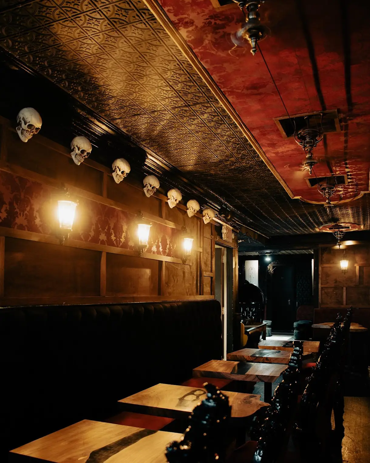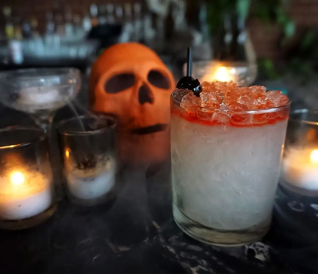 Each October, Boston restaurant Shore Leave turns into Scare Leave — a Halloween themed pop-up. The entire space is transformed with skeletons, cobwebs, and bloody-looking footprints. There's also themed cocktails as well.