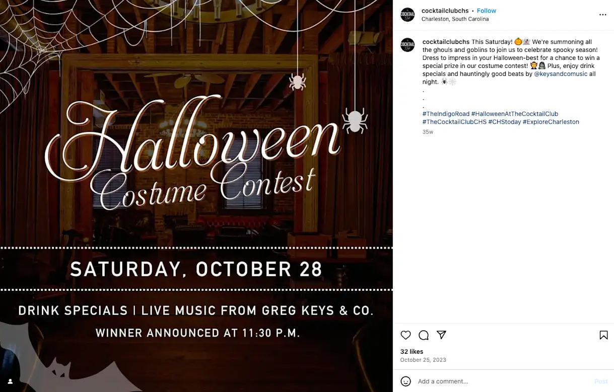 Consider throwing a Halloween party with a costume contest, food and drink specials or a set menu and live music. You can advertise the event through your restaurant’s website, social media channels, emails to past customers, and local online calendars. The Cocktail Club in Charleston hosts their annual The Night of the Thirsty Dead Party on Halloween night with prizes for the best costume.