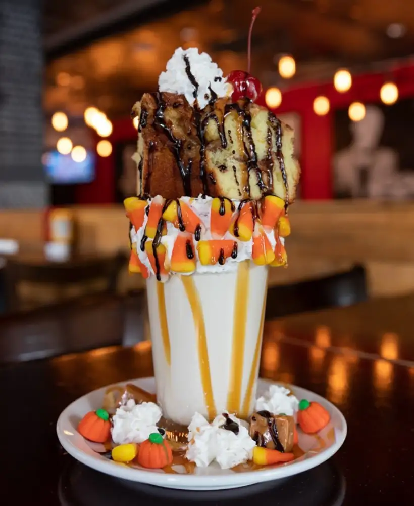 Over-the-top milkshakes are having a moment. This one from Boston Burger Company is a caramel apple milkshake with a walnut pumpkin cake on top, candy corns frosted to the side and mini pumpkins and caramel squares served on the plate.