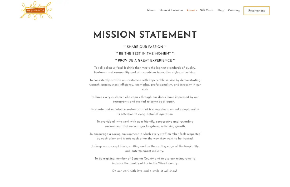The statement is clear and concise, articulating the purpose in a way that’s easy to remember. In just one sentence, you can understand why the restaurant exists and also the core values: social impact, sustainability, and economic empowerment.