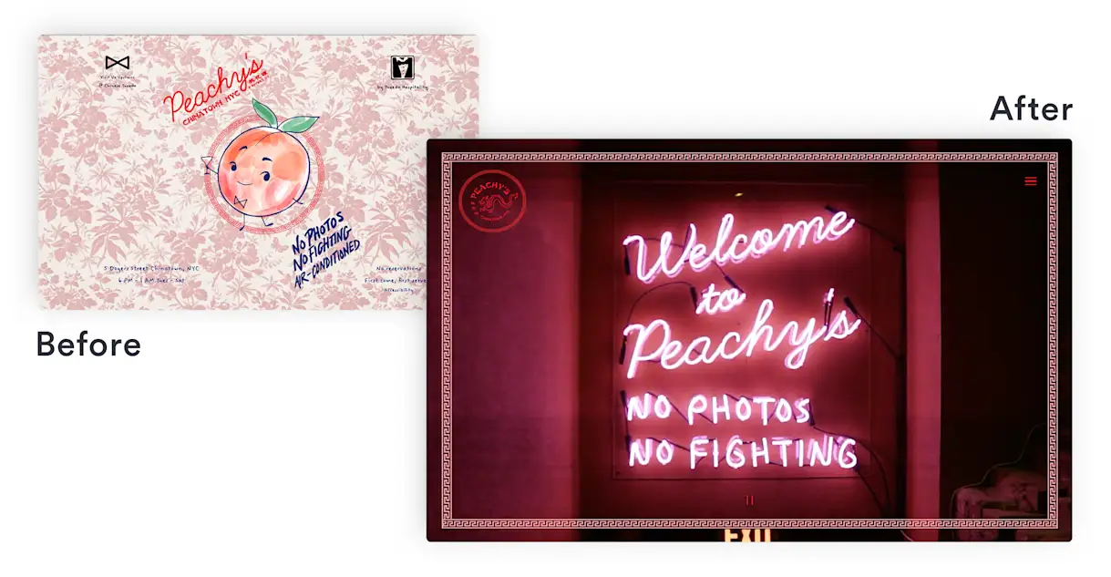 The neon lights and kinetic energy of Peachy’s perfectly capture the spirit of nightlife in New York City’s Chinatown. Now, it has a website that captures that spirit as well. The homepage features video snippets of the cocktail lounge’s chic decor, with quick cuts that convey a sense of energy and activity. Once guests are drawn in by the video, the hamburger menu in the top-right directs them to make reservations and private event inquiries.