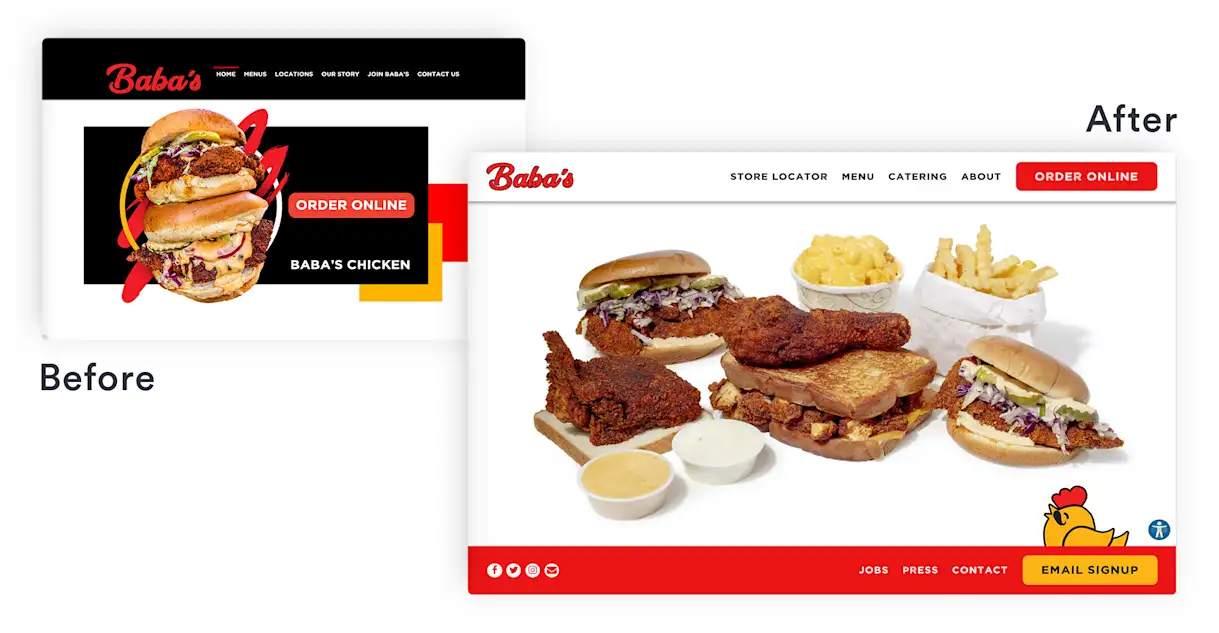 Baba's redesigned website packs as much flavor as its menu does. The California-based hot chicken chain uses red as a prominent statement color, along with white backgrounds and creative design elements to help the food photography pop. Given how "Instagrammable" its product is, the restaurant also makes smart use of the Instagram feed integration at the bottom of the page. Bonus points for writing a clear, compelling restaurant description — something you can read more about here.