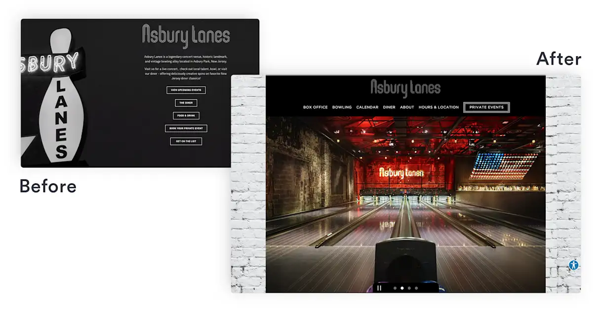 With a space as unique as New Jersey’s Asbury Lanes, photography is essential for capturing an ambiance. On its new website, the first thing guests see is a carousel that scrolls through photos of the bar, the diner, the event stage and the bowling alley, highlighting each of the famous party venue’s many amenities. Further down the homepage, the website makes brilliant use of BentoBox’s Instagram feed integration, using it to showcase posters for upcoming musical performances.